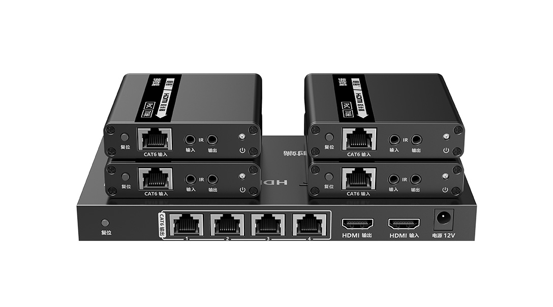本产品为1进4出HDMI™网线分配延长器, 可将1路HDMI™信号分配至4路RJ45 网络信号输出,搭配4个接收器可将HDMI™信号传输至70米。产品支持4K@30Hz分辨率,双向红外回传,RS-232控制,3.5mm音频输出等功能。 产品适用于商场、演播厅、户外广告、家庭娱乐及多媒体教室等场景。