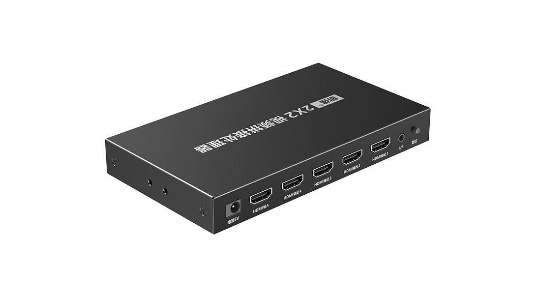 此款产品为4K@60Hz 2x2视频拼接处理器,可实现1路HDMI信号输入,4路HDMI 信号输出。支持1x2/1x3/1x4/2x2多种拼接模式,可通过RS-232或拨码开关进行设 置。产品灵活适配不同安装需求,可广泛应用于安防监控、户外广告、家庭娱乐及教 育培训等领域。